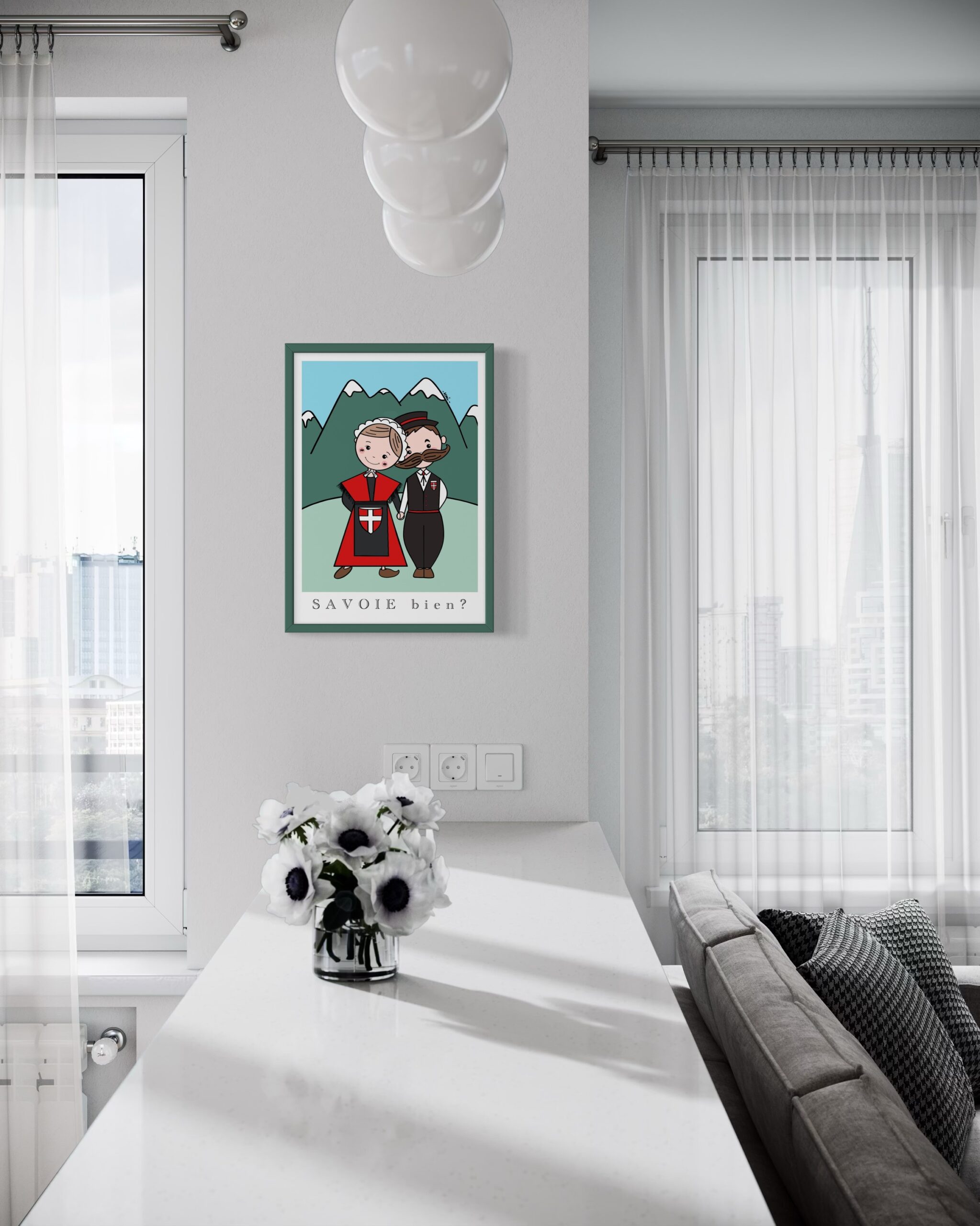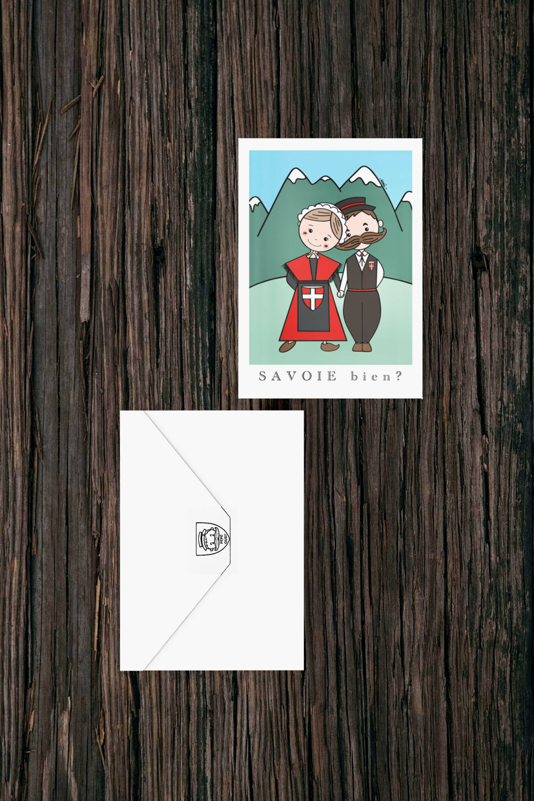 L’amour savoyard, simple et sincère. Sur cette carte postale tendre et lumineuse, Pépé Gust et la Péronne, se tiennent main dans la main, un geste tout en délicatesse qui en dit long sur leur complicité. Une illustration pleine de chaleur humaine et de poésie alpine, parfaite pour transmettre un message d’amour intemporel, ou simplement faire sourire avec une scène empreinte d’authenticité.