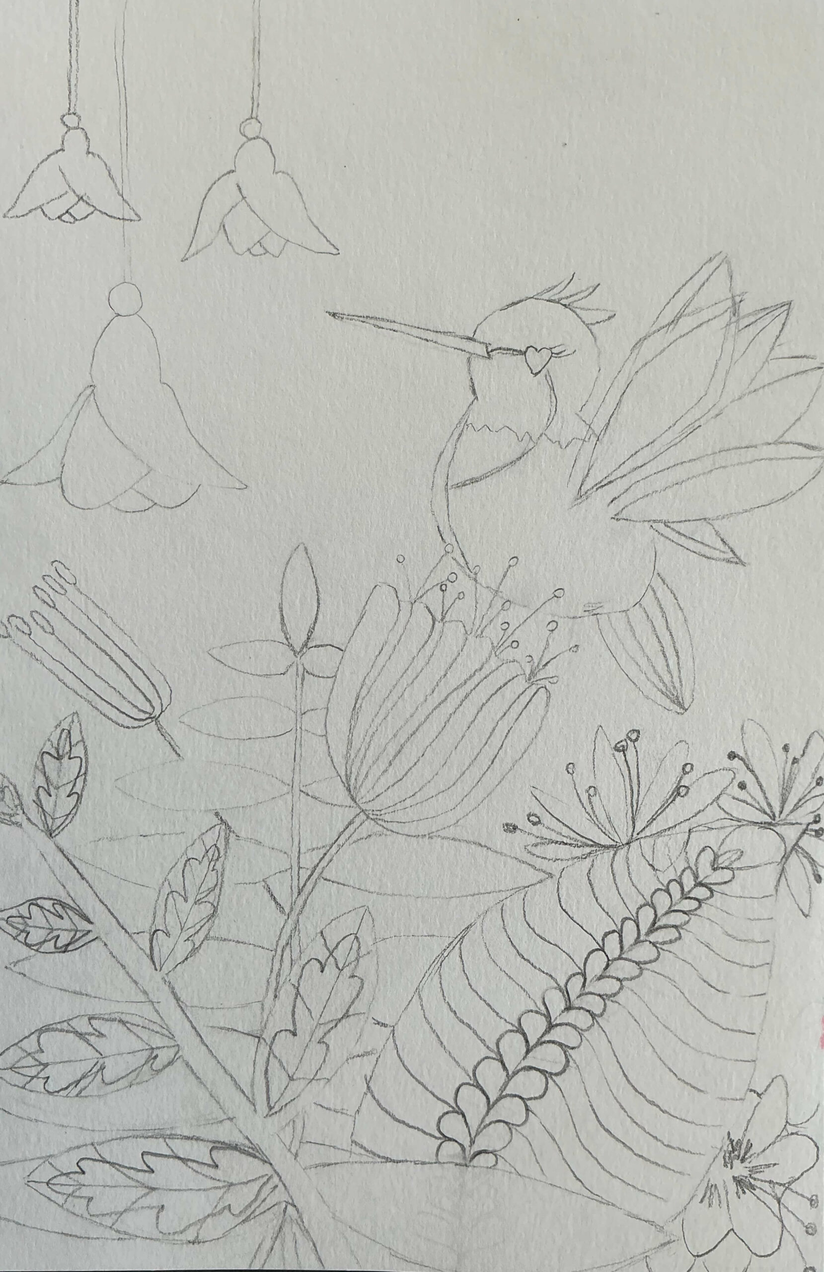 Le sujet principal est un colibri, délicat et plein de charme, qui se pose au milieu d’un paradis floral. Avec des yeux en forme de cœur, il semble incarner l’essence même de l’amour et de la douceur, comme un messager d’un monde féerique où tout semble possible.