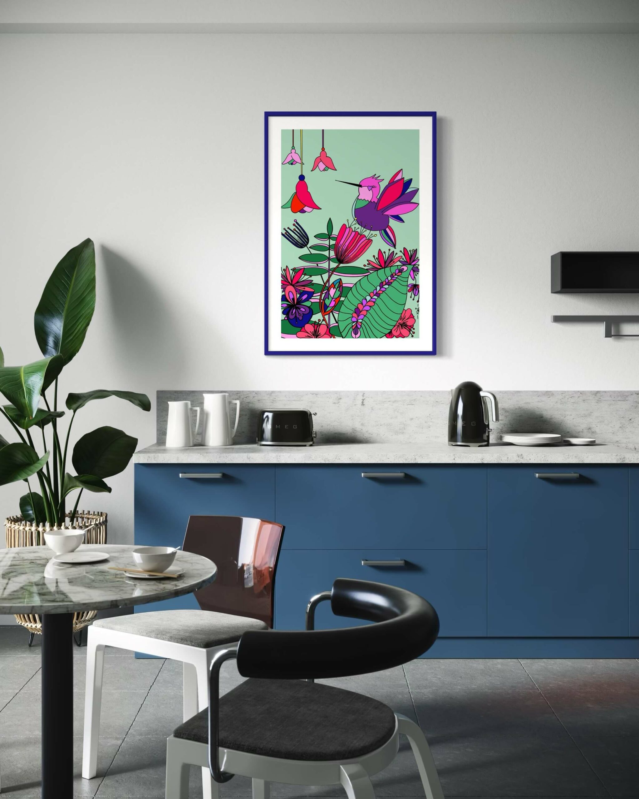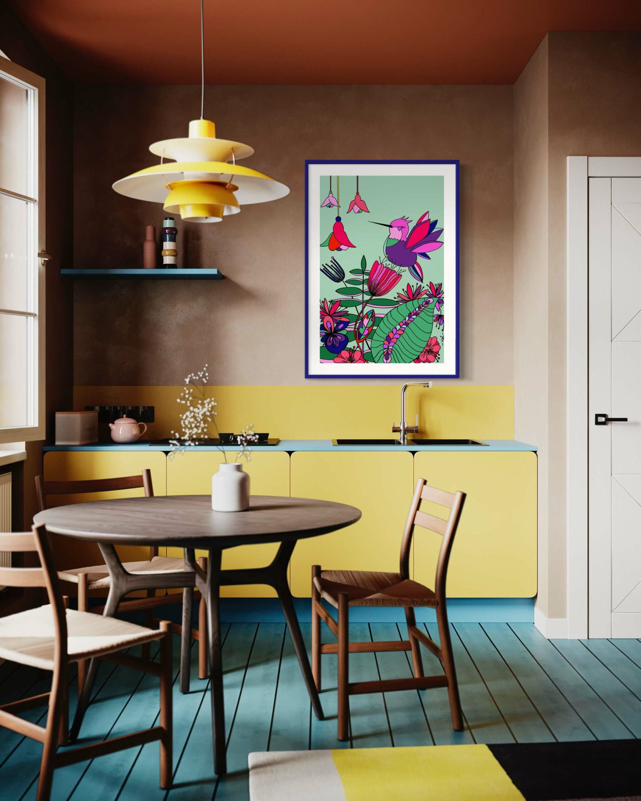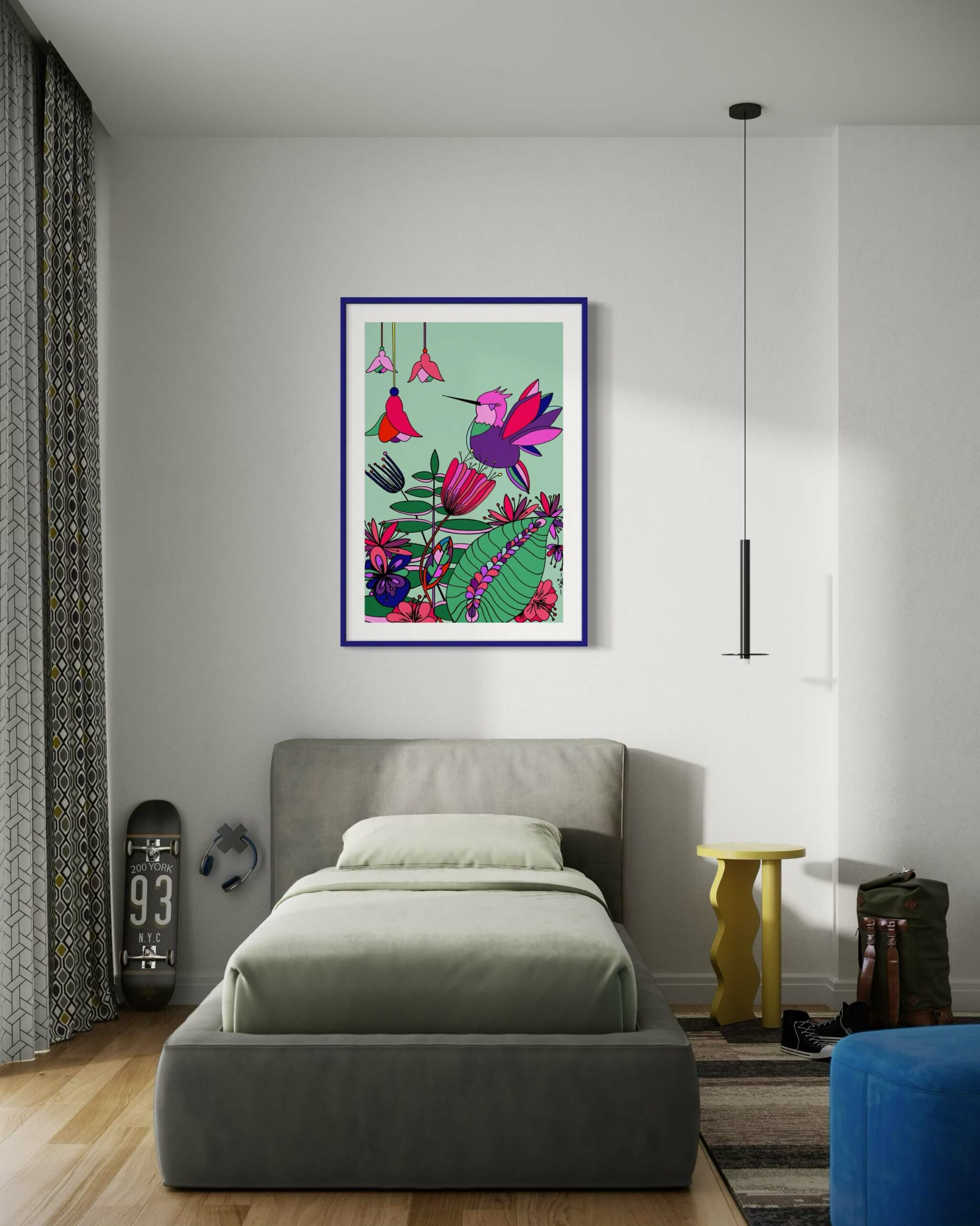Dans Colibris Joli Joli, l’artiste nous transporte au cœur d’un tableau vibrant, où l’énergie de la nature et la beauté des couleurs se fusionnent dans une explosion de vie.