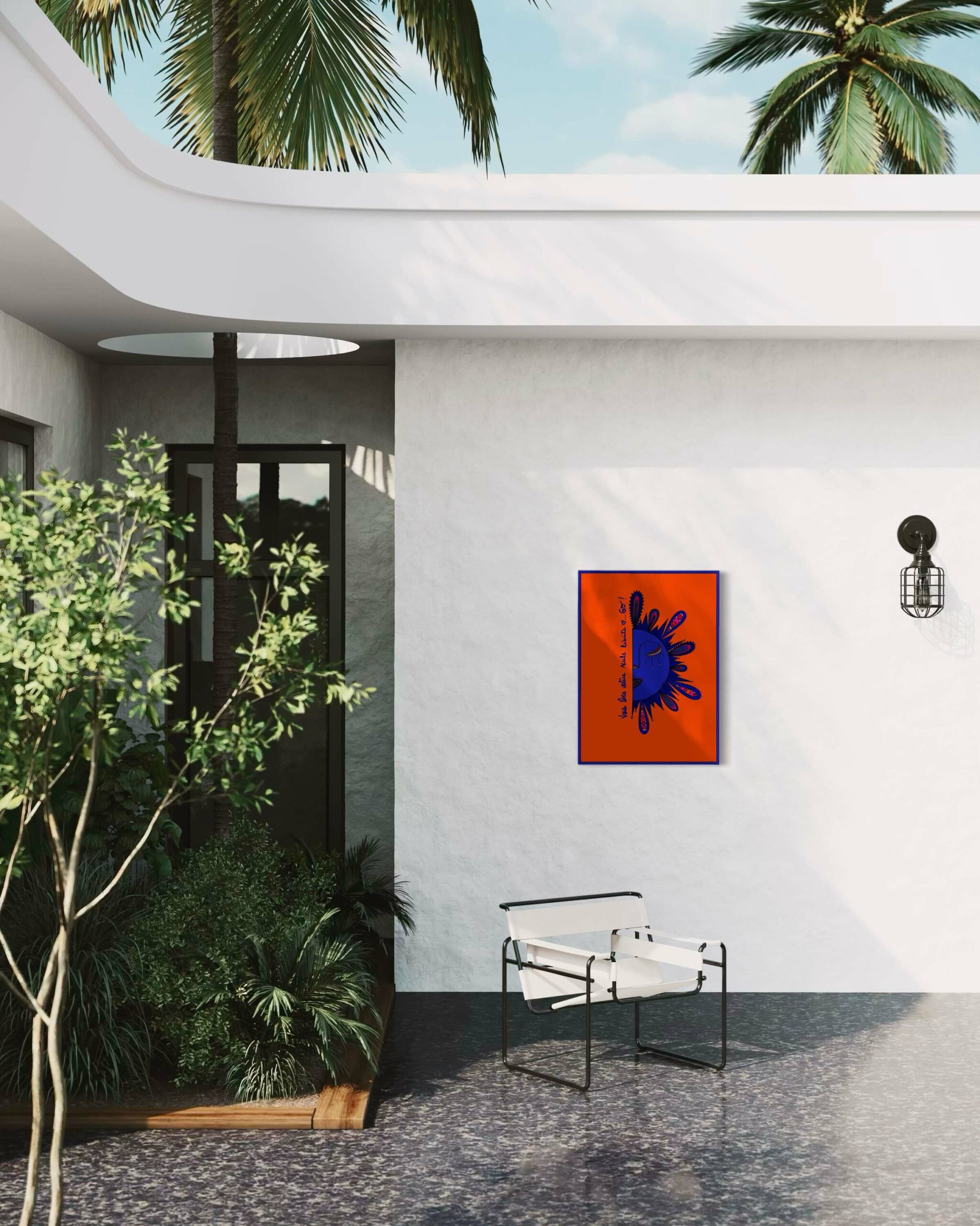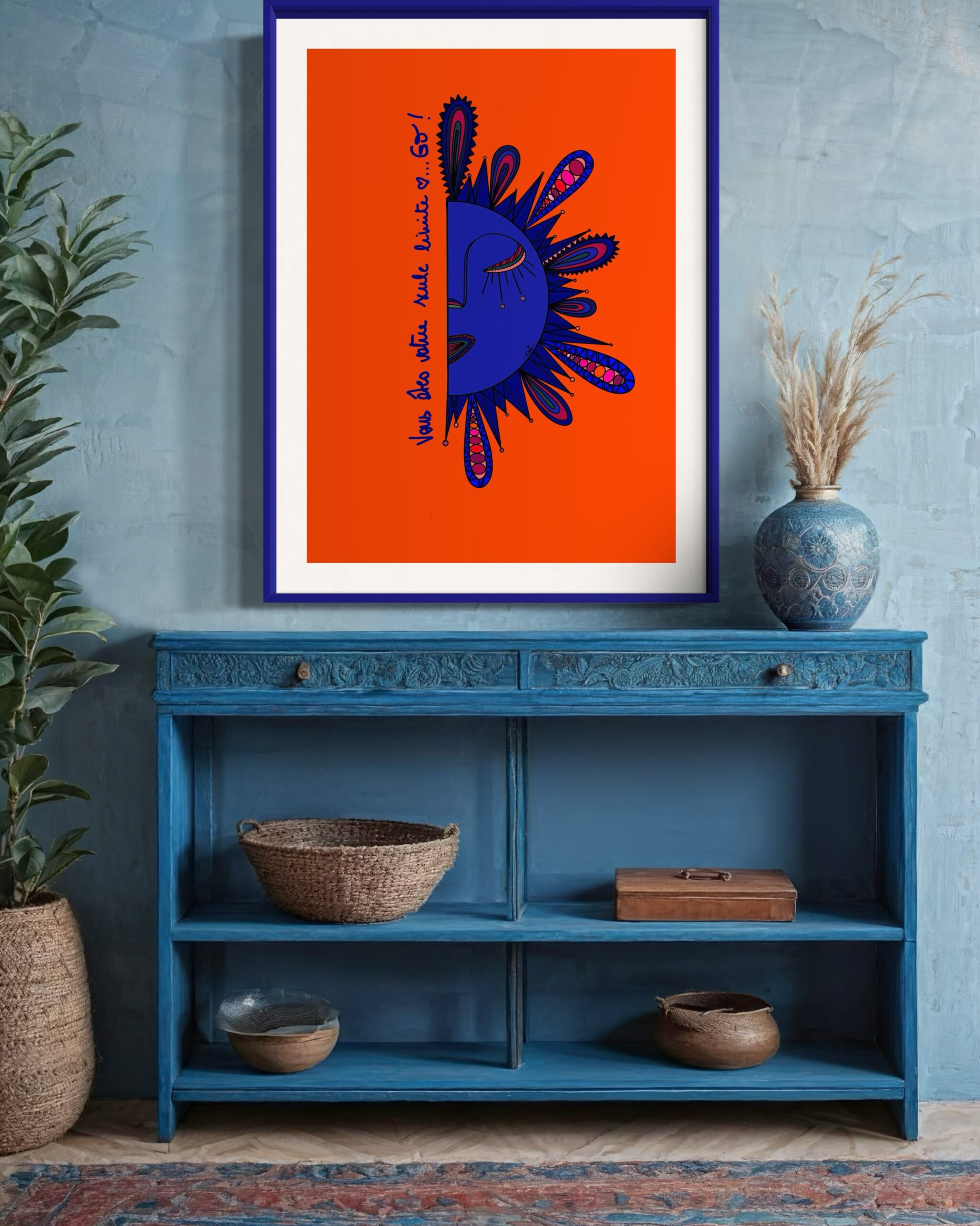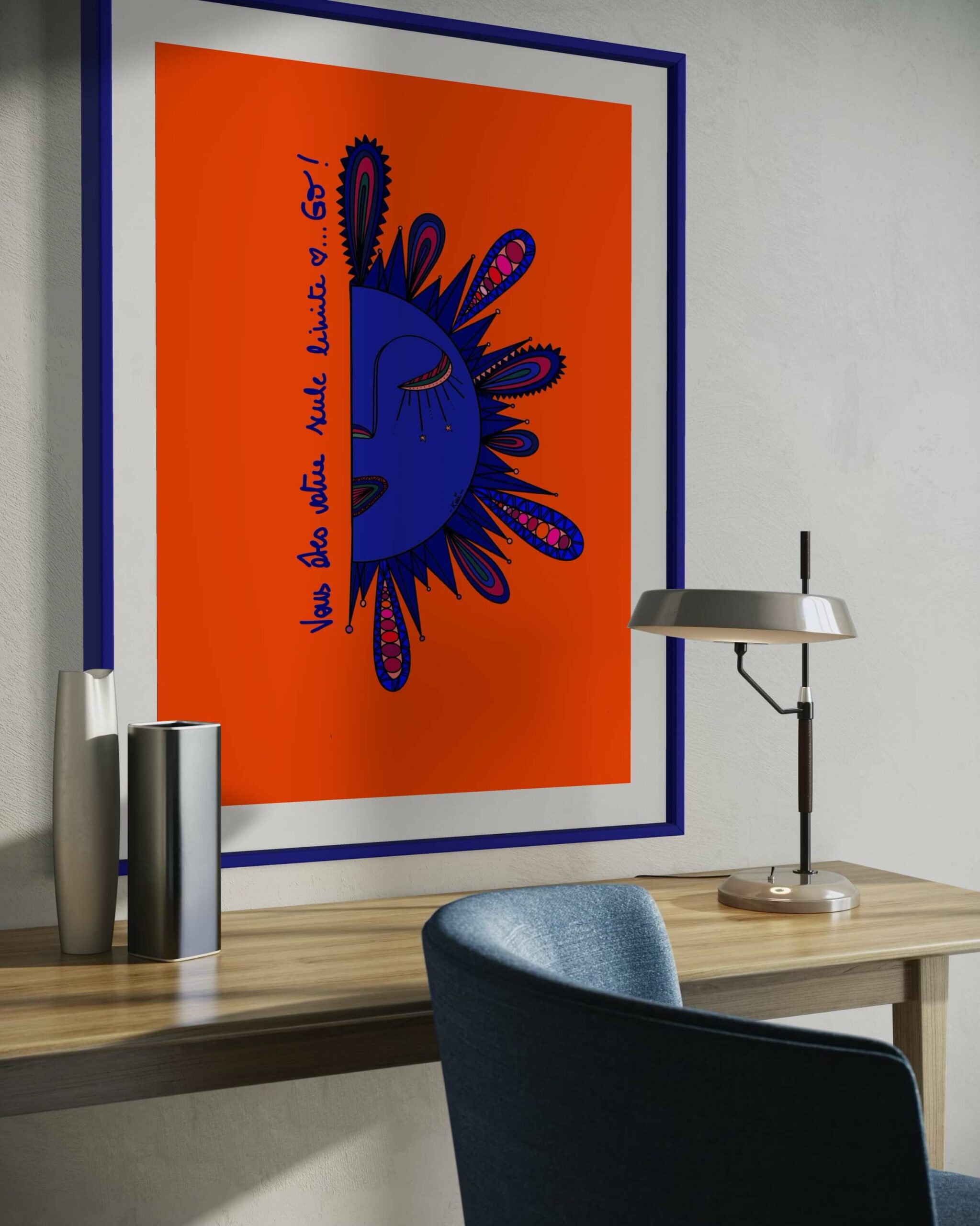 Plongez dans un univers vibrant avec ce tableau solaire où l’énergie se mêle à la sérénité. Au centre, un soleil bleu au visage paisible irradie un calme profond, contraste saisissant sur un fond orange chaleureux. Son expression douce invite à l’introspection, à la reconnexion avec soi. Un écriteau vient murmurer une impulsion douce mais déterminée : « Vous êtes votre seule limite… GO »