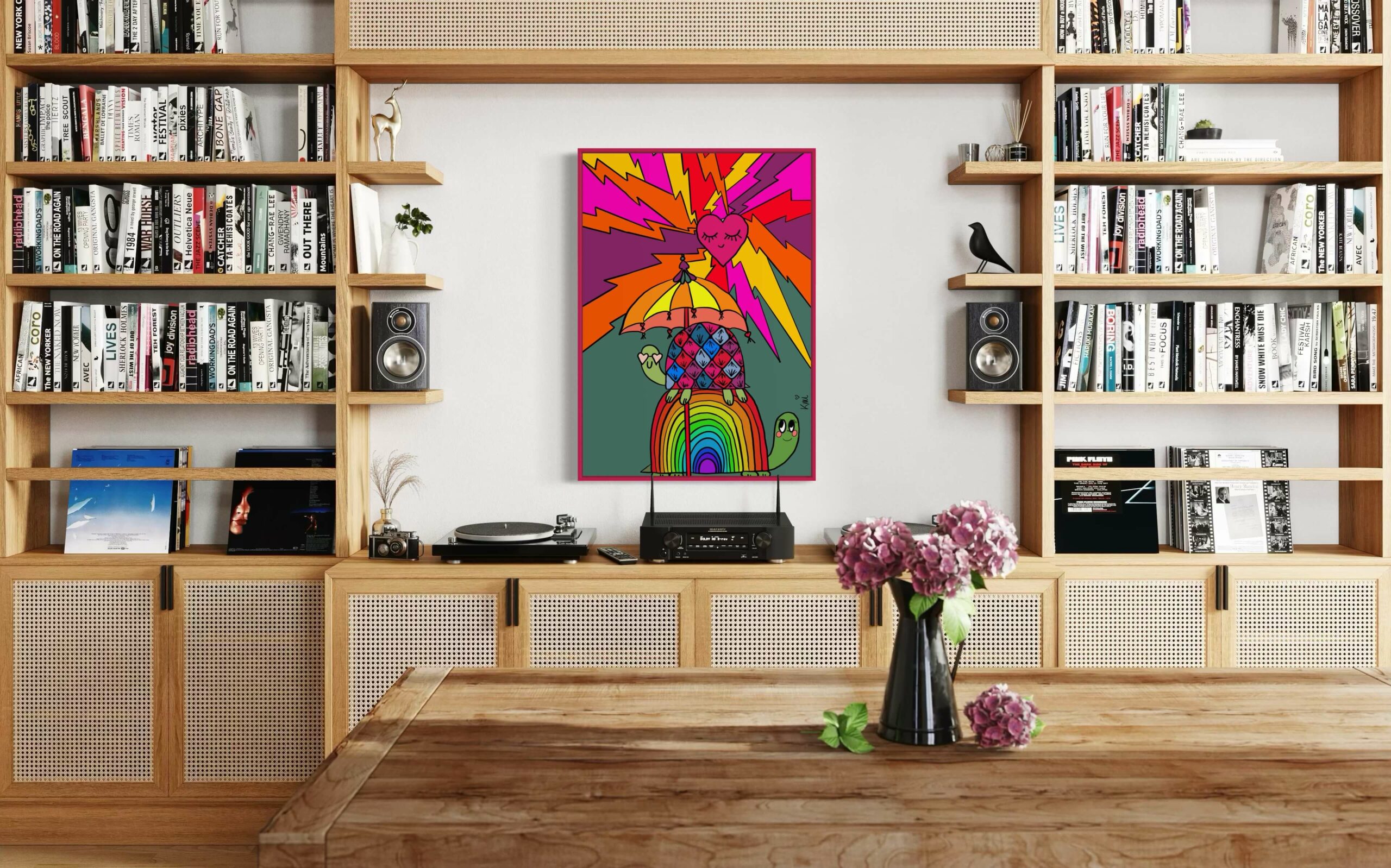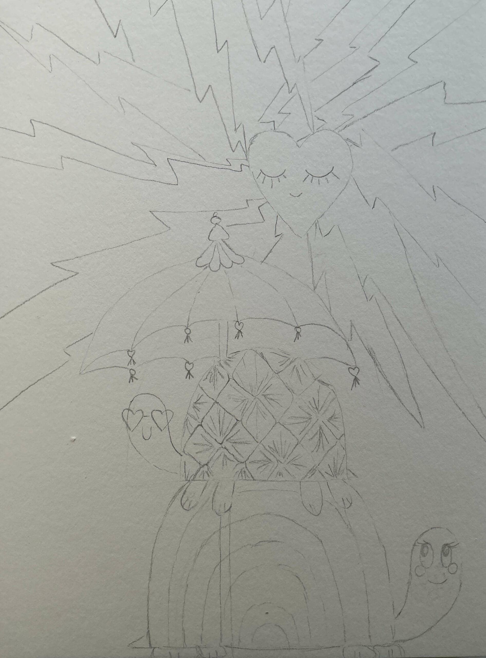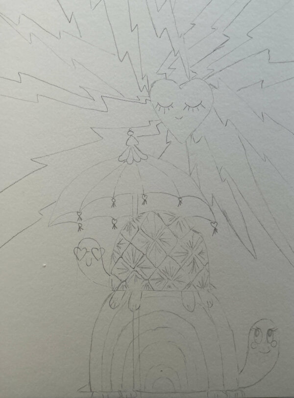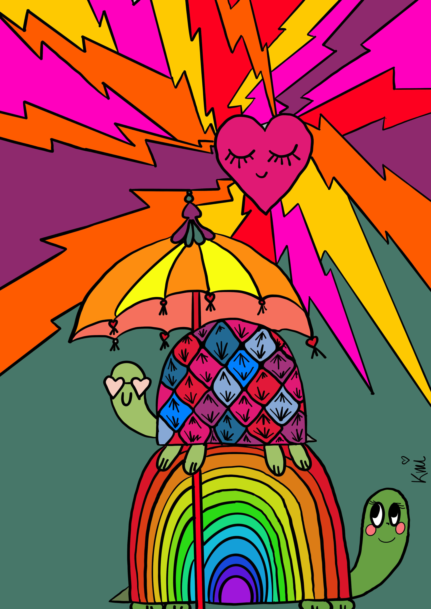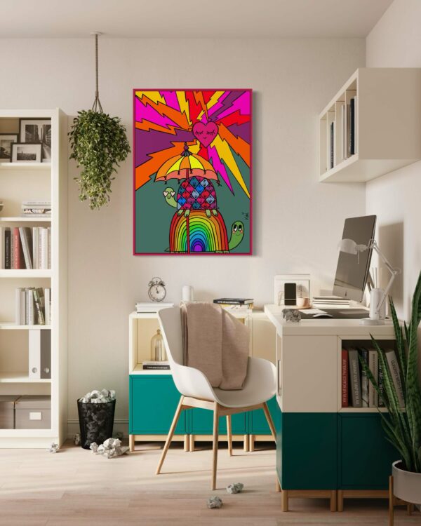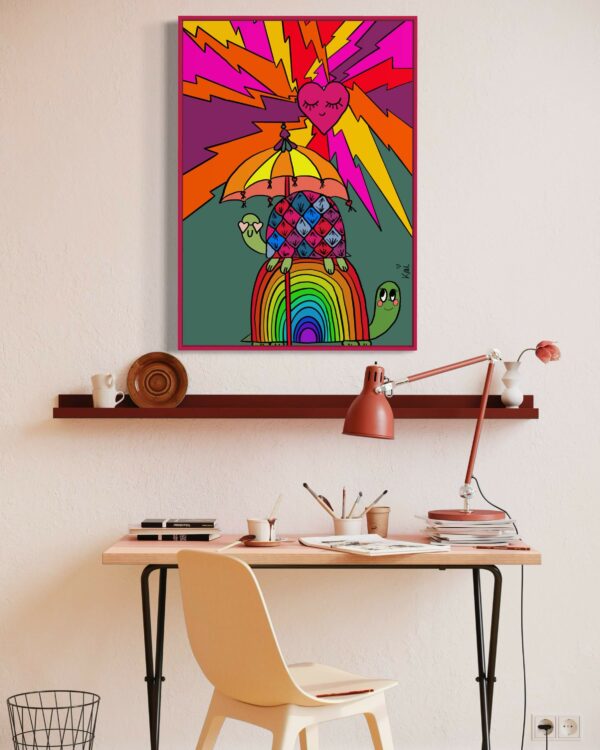 Au-dessus d’elles, un grand cœur dans le ciel irradie des éclairs multicolores, comme une pluie d’énergie, d’émotions et de lumière. Loin d’effrayer, cette tempête colorée devient une bénédiction, un orage d’amour que les tortues affrontent ensemble, protégées, unies.