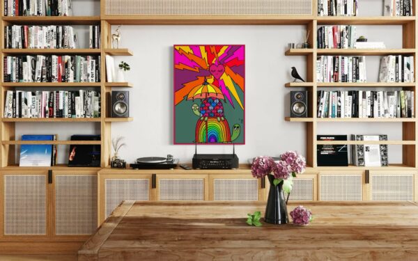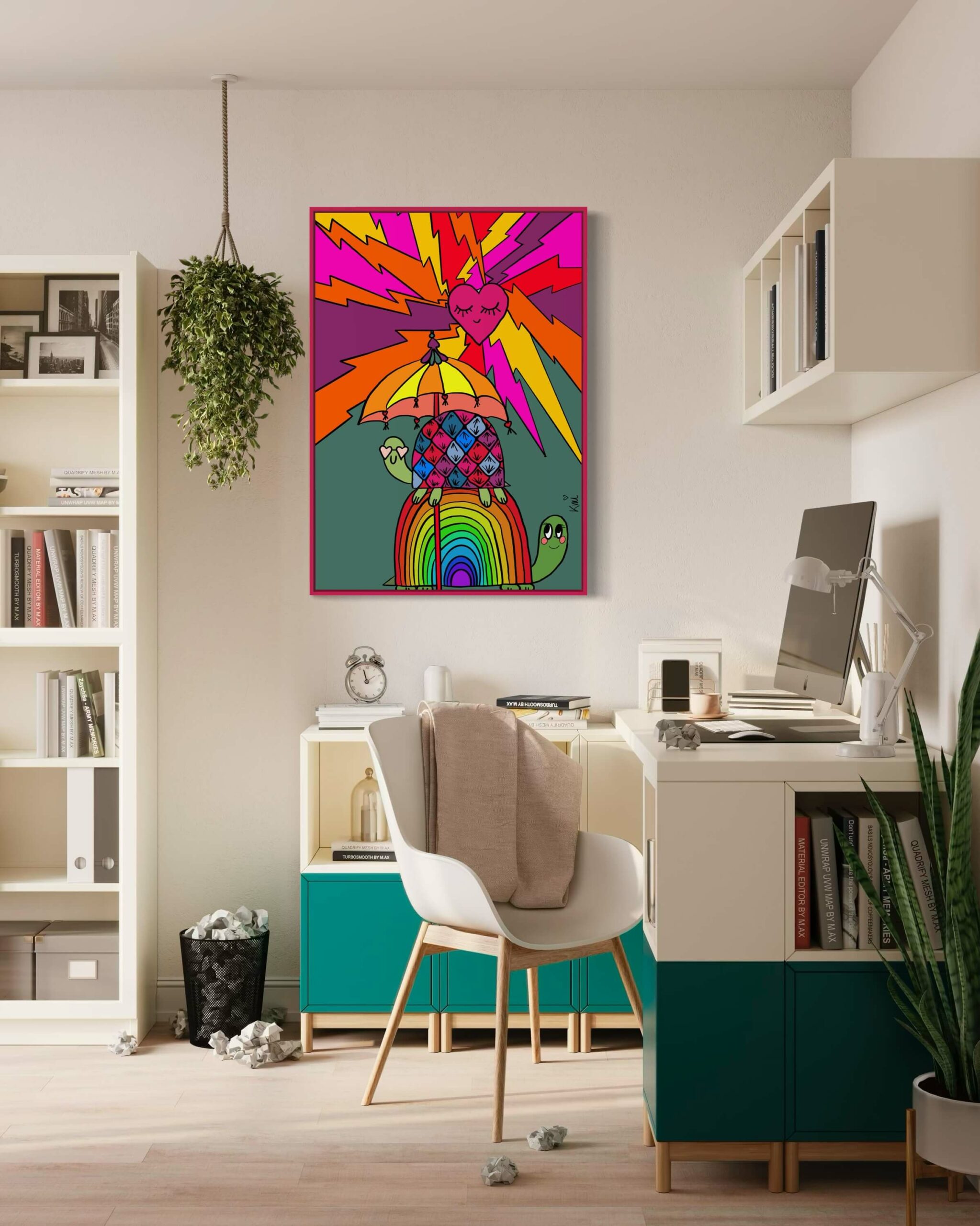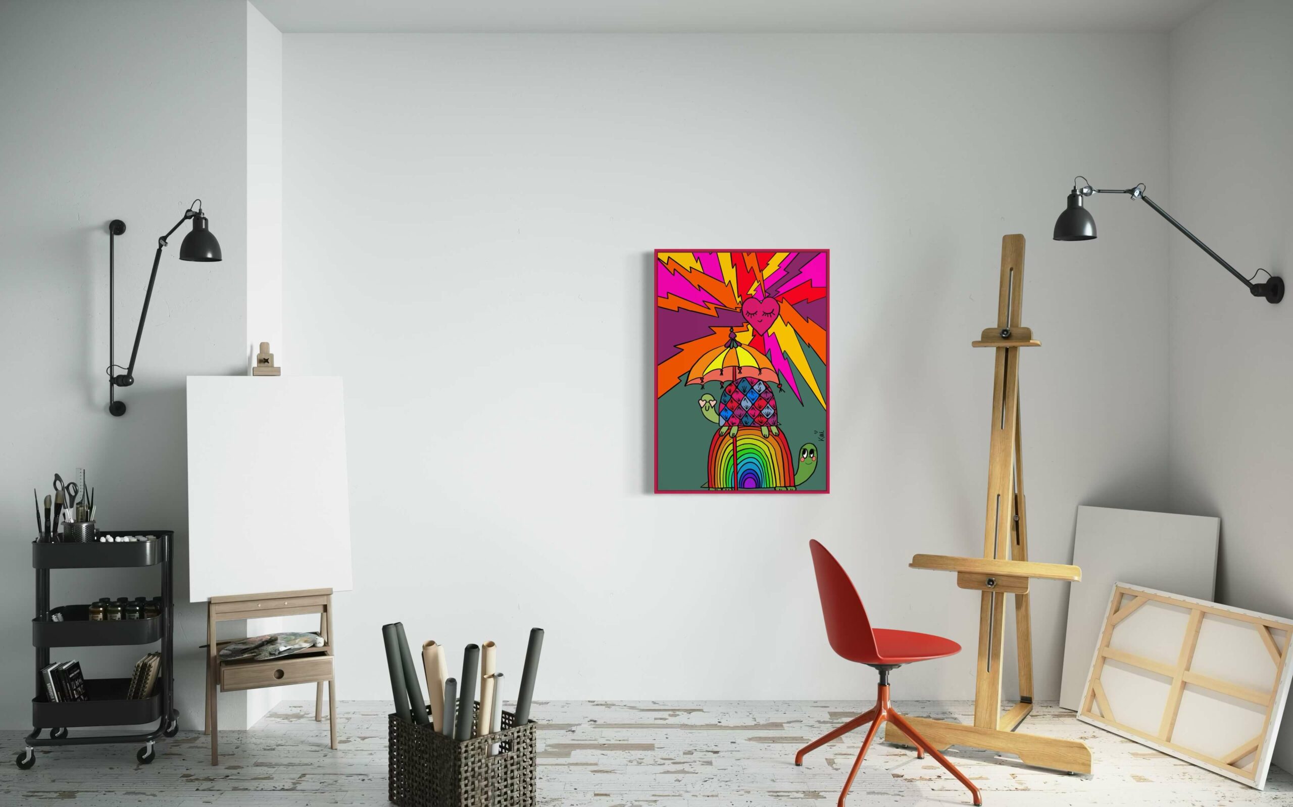 Dans ce tableau vibrant et symbolique, deux tortues, s’abritent tendrement sous un grand parasol balinais. Leur posture évoque l’amour, le soutien, la lenteur paisible d’une relation solide et ancrée.