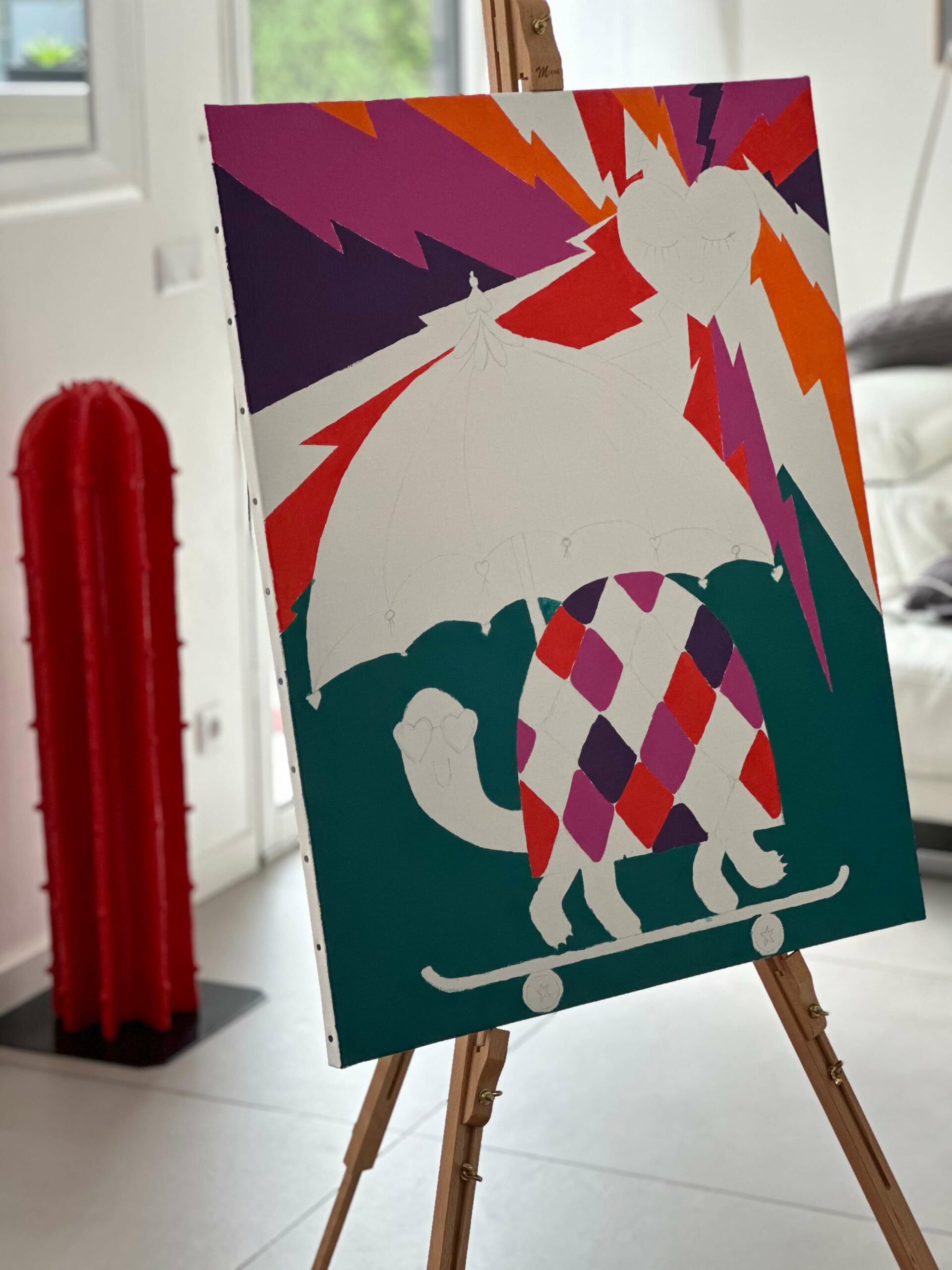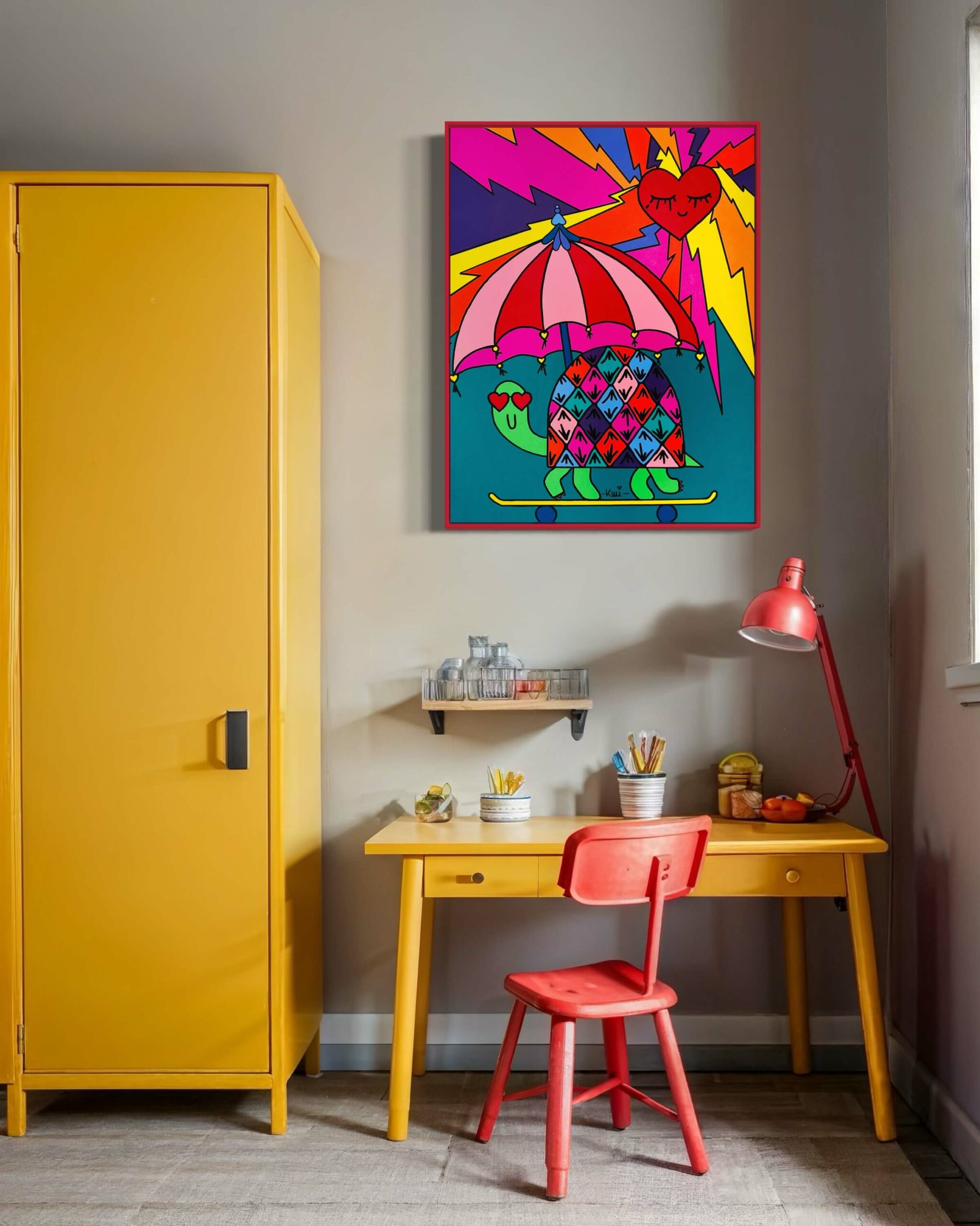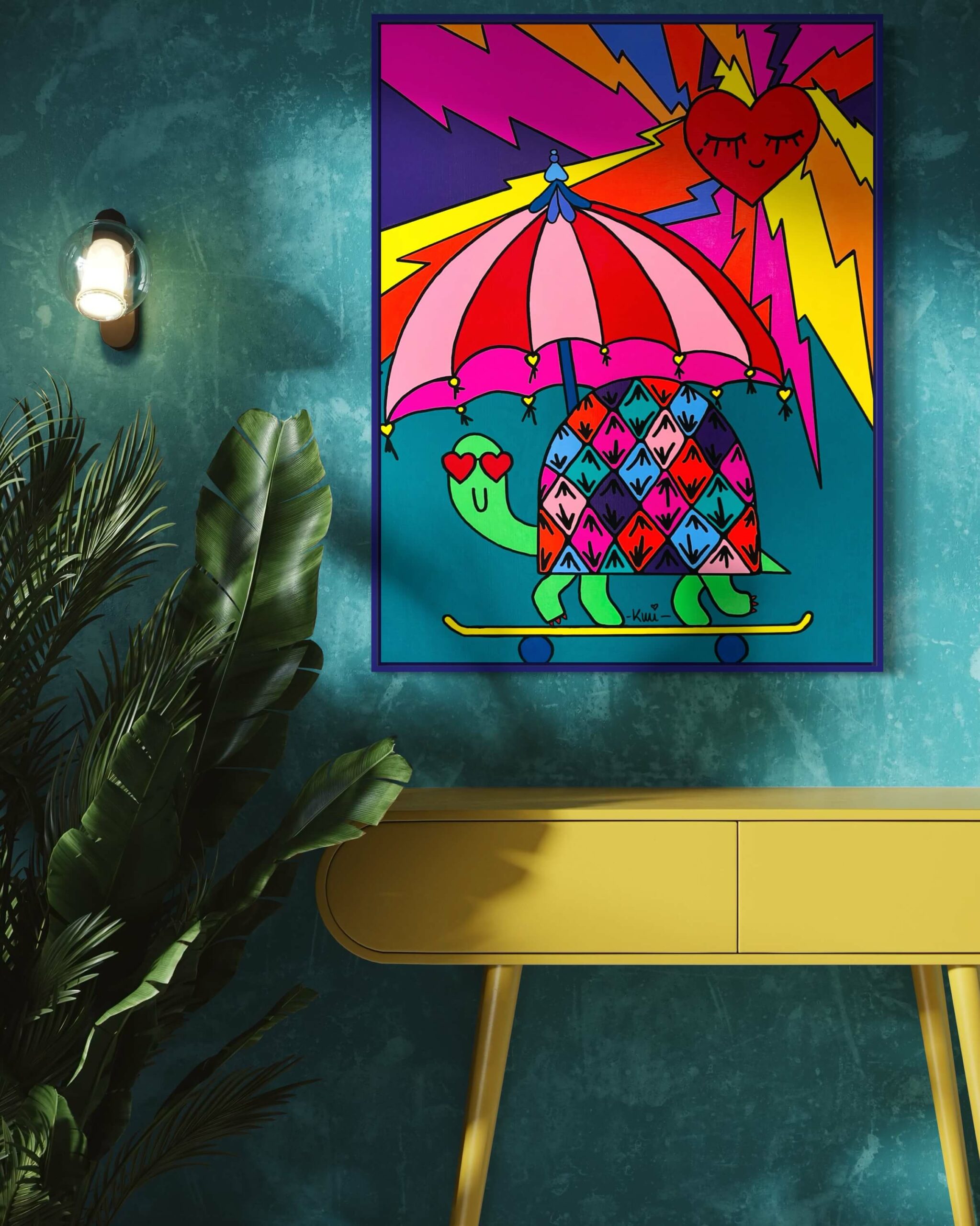 Avec son style naïf et ses teintes éclatantes, ce tableau évoque les joies simples de l’enfance, les courses folles dans les rues, les rêves sans fin et les cœurs légers. « Tortue on Board » est une ode à la fantaisie, à la lenteur qui n’empêche pas l’audace, et à la joie pure, sans filtre. Un clin d’œil coloré à celles et ceux qui n’ont jamais oublié de rêver.