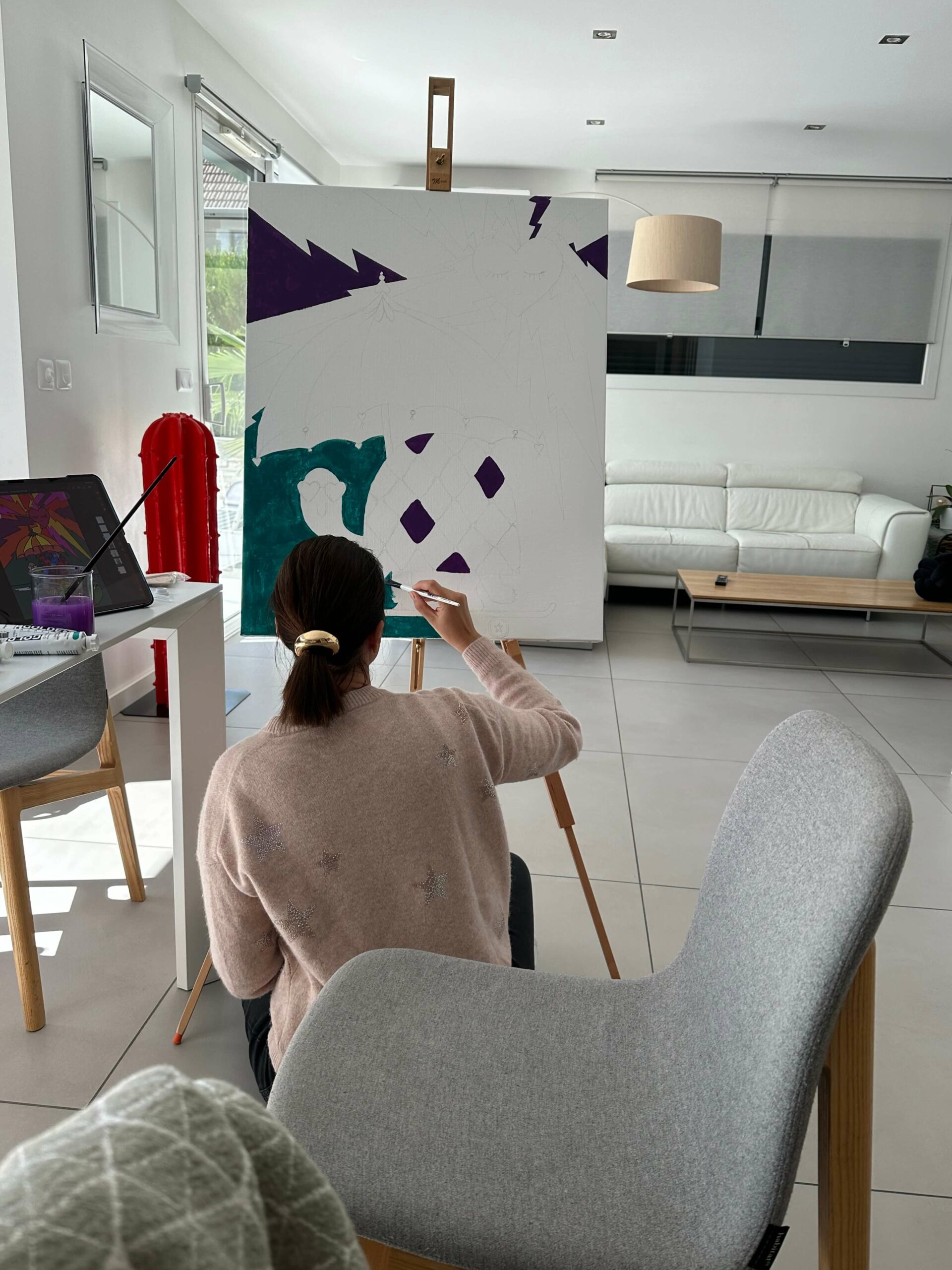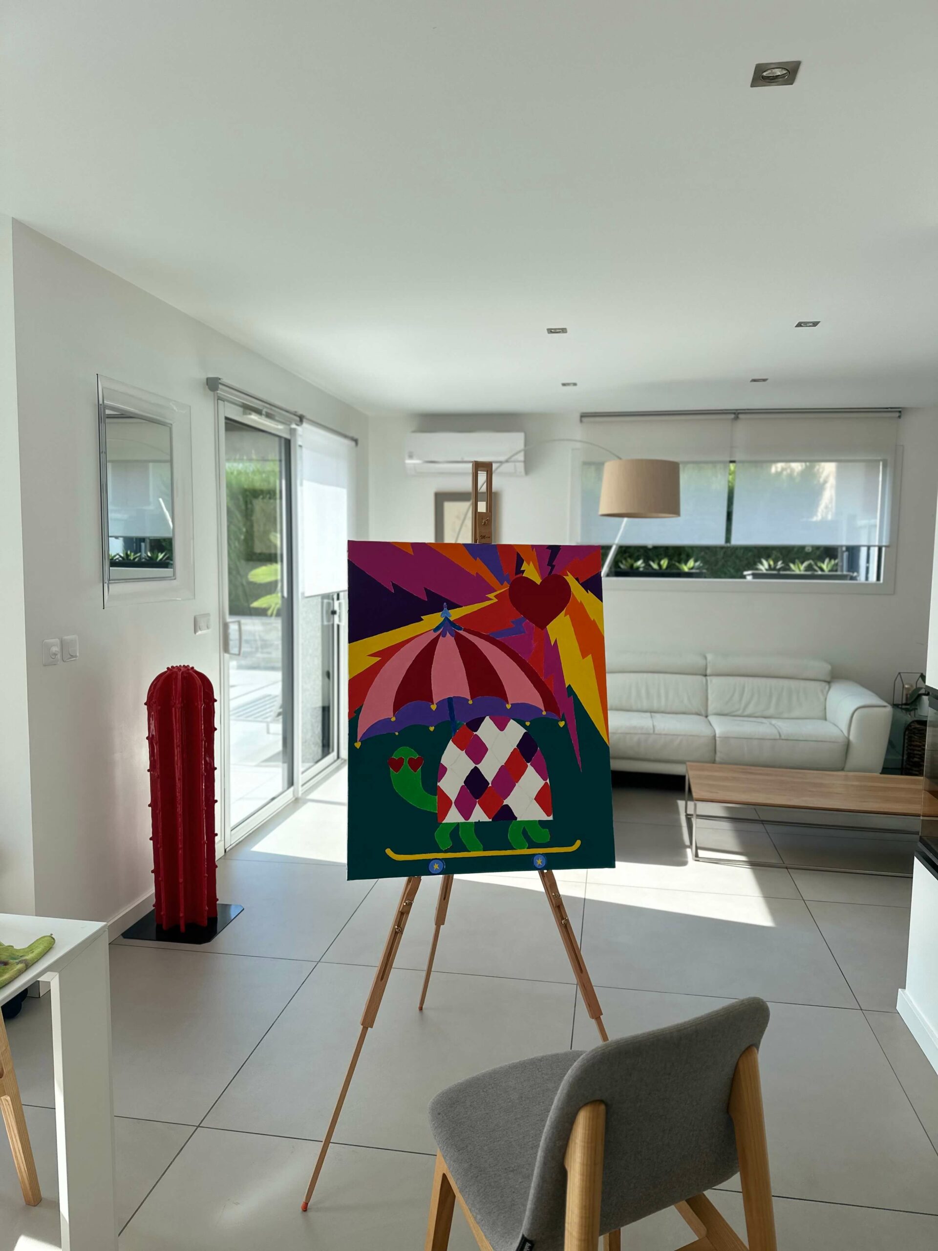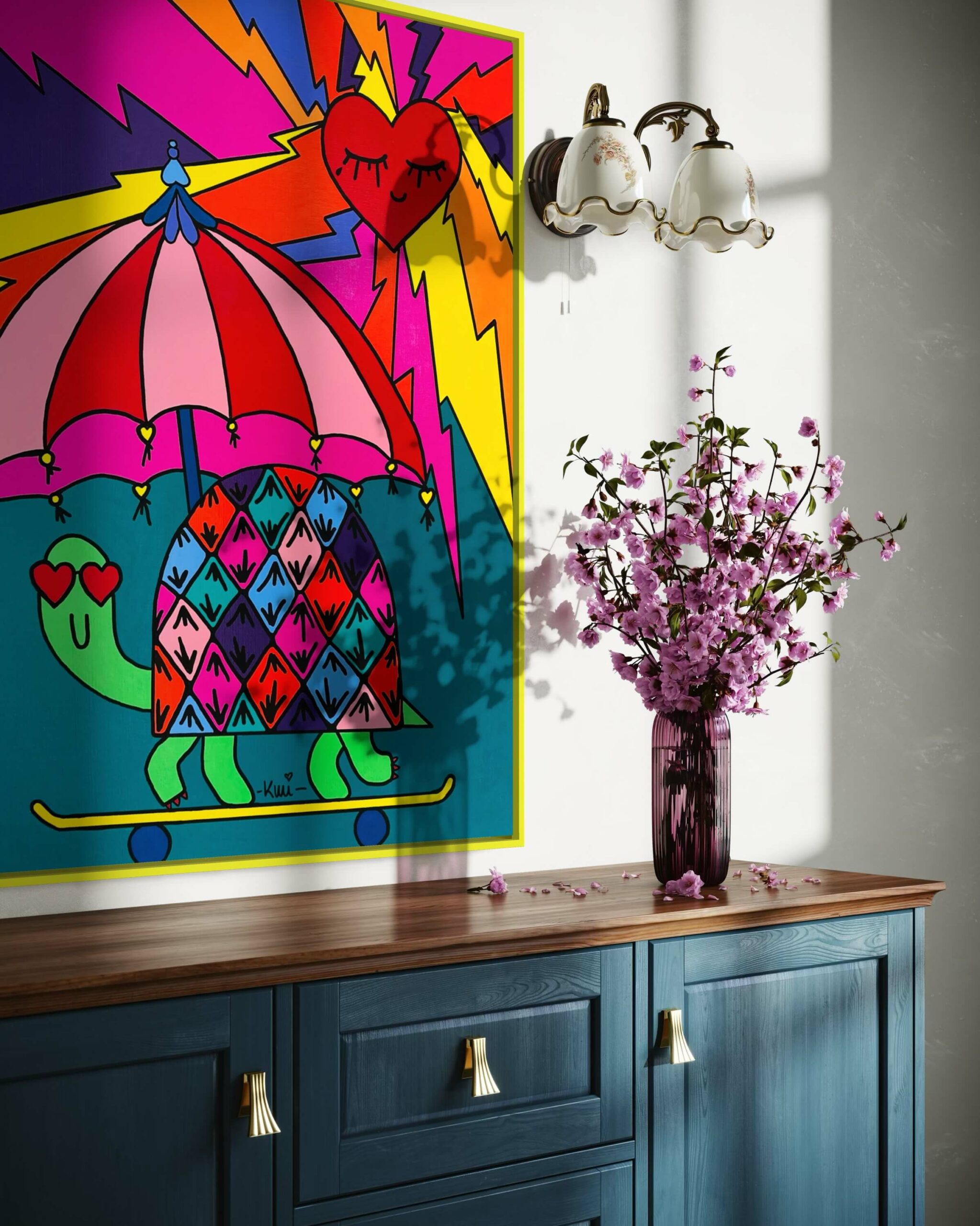 Avec son style naïf et ses teintes éclatantes, ce tableau évoque les joies simples de l’enfance, les courses folles dans les rues, les rêves sans fin et les cœurs légers. « Tortue on Board » est une ode à la fantaisie, à la lenteur qui n’empêche pas l’audace, et à la joie pure, sans filtre. Un clin d’œil coloré à celles et ceux qui n’ont jamais oublié de rêver.