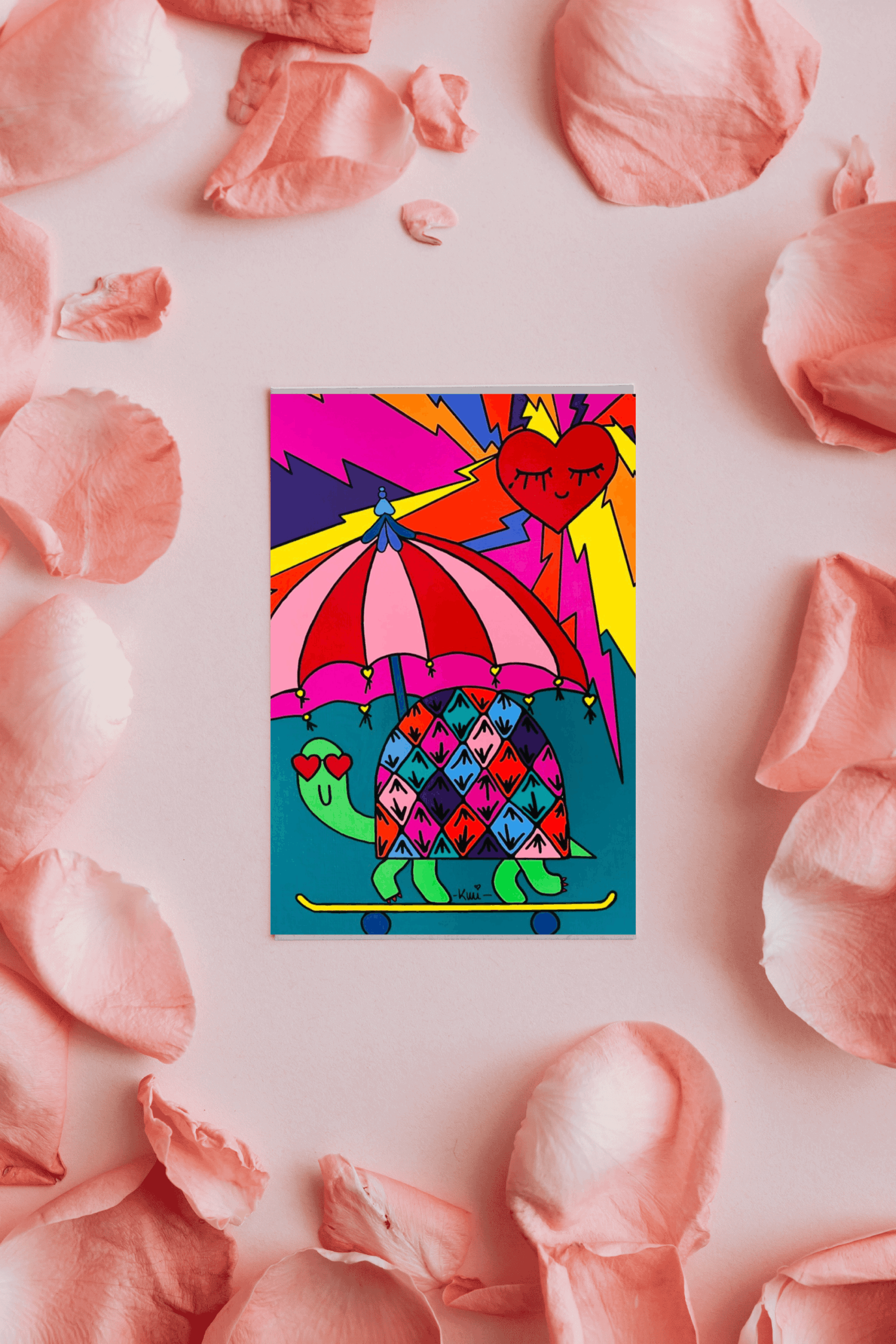 Une tortue pas comme les autres, perchée sur son skateboard avec des lunettes en forme de cœur.