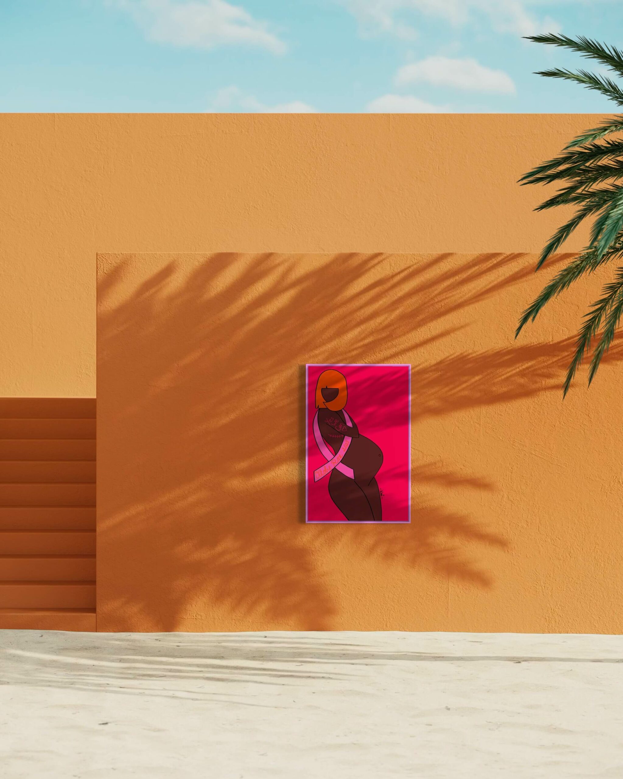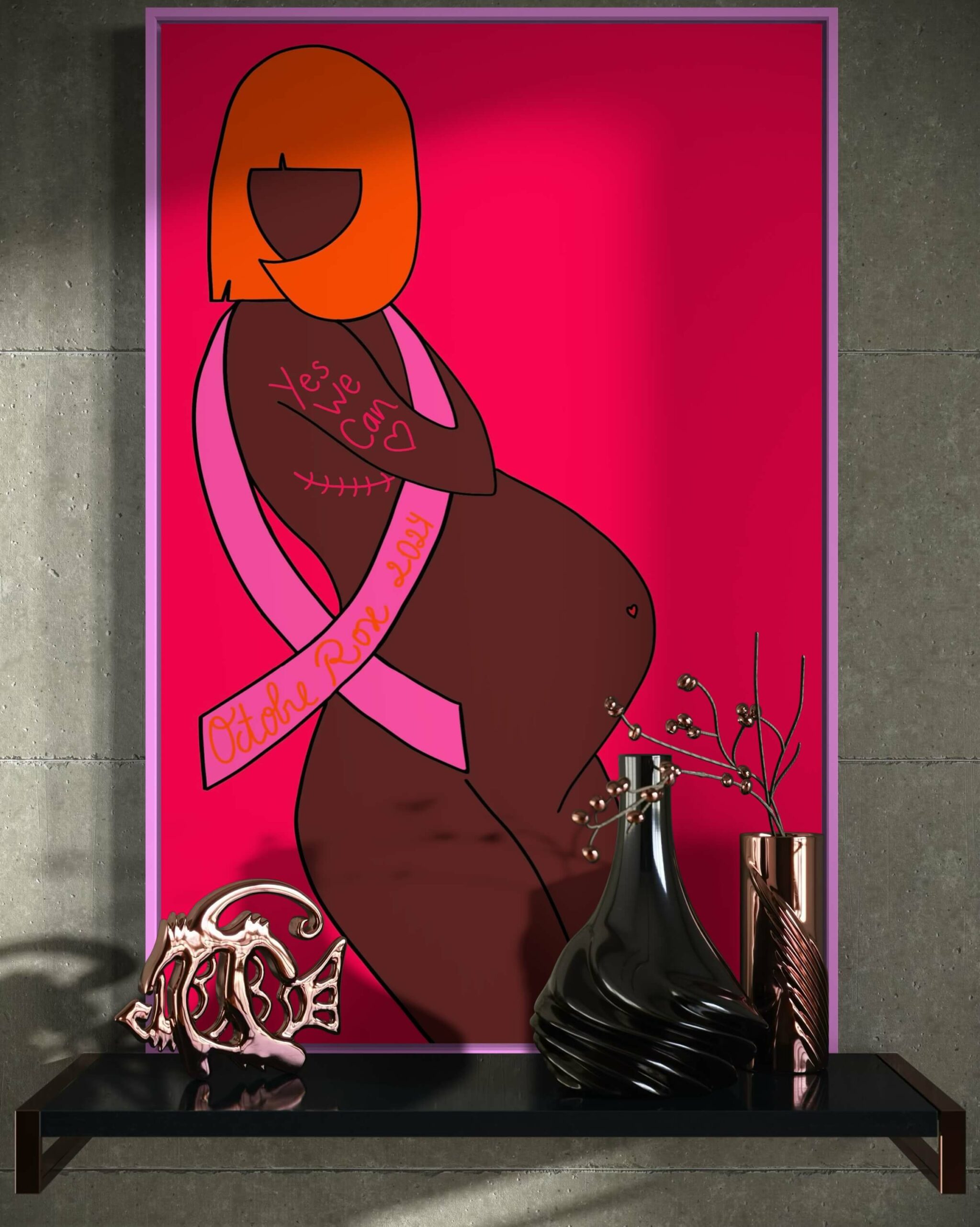 Dans ce tableau vibrant aux teintes pop de rose et d’orange, une femme enceinte incarne la force et l’espoir. Elle se tient droite, fière, arborant le célèbre ruban rose tel un emblème de victoire, comme une Miss célébrant toutes les femmes combattantes. Sur son bras tatoué, le message puissant “Yes We Can” affirme sa détermination. Une cicatrice sur son sein rappelle le combat contre le cancer du sein — un combat que de nombreuses femmes mènent même pendant la grossesse.